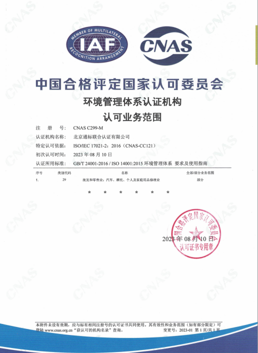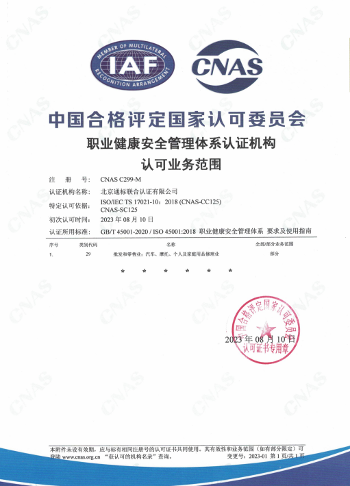 北京通标联合认证有限公司(以上简称TBUC)2023年8月10号顺利获得中国合格评定国家认可委员会(简称CNAS)的认可证书(注册号:CNAS-C299-M)。